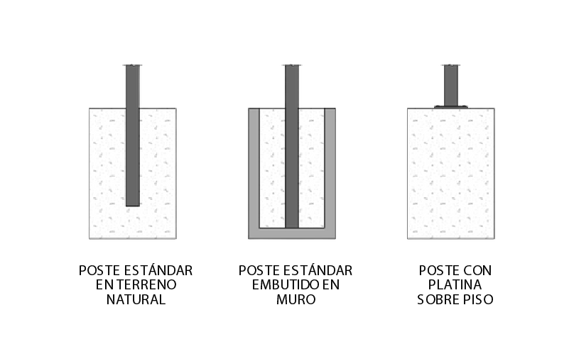 Puede instalarse sobre suelo natural, embutido en hormigón o con fijaciones mediante platinas o chapas de sujeción, adaptándose a distintas superficies.