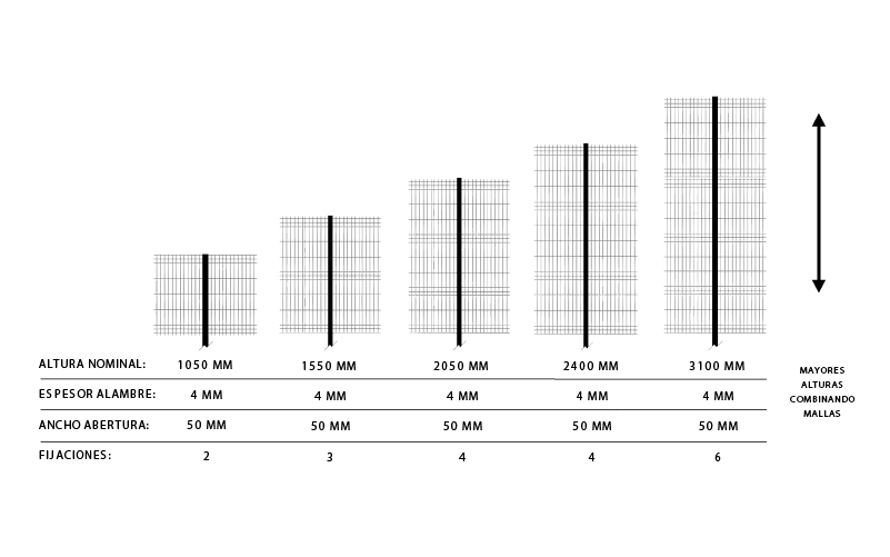 Los paneles tienen un ancho estándar de 2500 mm y alturas de 1050 a 3100 mm. Pese a su mayor densidad de alambres su peso es de 7 kg por metro cuadrado, sin afectar su fácil maniobra y transporte.
